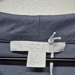 The COS Blouse is a minimalist and modern women's top in a size 10 and blue color. It features a funnel neck and 3/4 sleeves, making it a stylish choice for the contemporary woman. Made from a blend of cotton and cupro, this blouse from the designer brand COS offers a classic and fitted sleeve style. Perfect for those who appreciate a blend of designer and preppy elements in their wardrobe, this tunic-style blouse is a versatile piece that can be worn in various settings.
