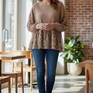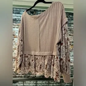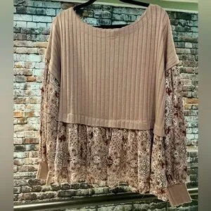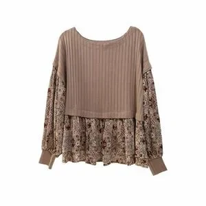 Soft and feminine boho-inspired top by Gimmicks, sold at Buckle. Features a ribbed knit bodice in a warm taupe/mocha tone paired with flowy, paisley-floral woven sleeves and a matching peplum hem. The mixed-media design gives this top beautiful texture and movement while remaining comfortable and flattering.