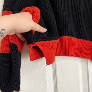 Moon & Madison Colorblock Cropped Sweater, Size Medium — Bold Primary Colors. This eye-catching knit features a vibrant mix of black, red, cream, and mustard yellow in a unique colorblock pattern. The design includes a textured cable knit stripe and a modern cropped silhouette with wide, slightly batwing sleeves. Perfect for layering with high-waisted denim for a trendy minimalist or streetwear look. Good pre-owned condition with no major flaws.