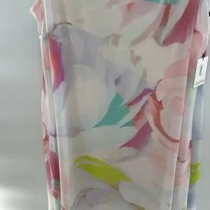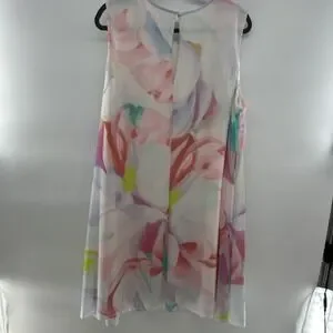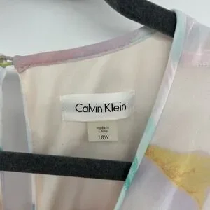 The Calvin Klein Women's NWT Printed Trapeze Watercolor Flowy Dress in size 18W is a stylish and comfortable option for the summer and spring seasons. The floral pattern and multicolor design add a touch of femininity to the sleeveless dress, with a round neckline and button closure for a classic look. Lined for added quality, this polyester blend dress is perfect for any casual or dressed-up occasion, showcasing the renowned Calvin Klein brand for a sophisticated feel. Made in China, this dress is a must-have for any fashion-forward woman.