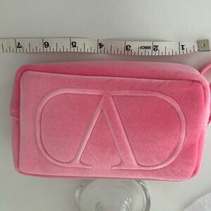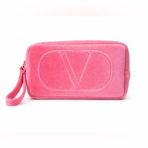Elegant and compact Valentino Petite Pochette in a soft rose pink shade. This small mini pouch features a plush velvet-like exterior with an oversized embossed Valentino “V” logo on the front, finished with a gold-embossed zipper pull strap for a refined, luxury touch.