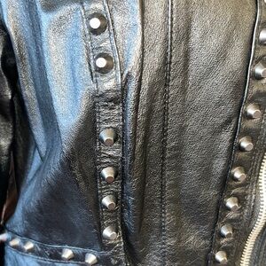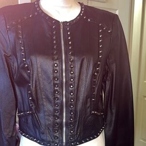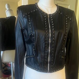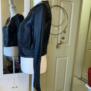 Sleek black leather jacket with studded accents. Adds a bold touch to your look. A few (5) studs missing. Practically new well taking care of 💎