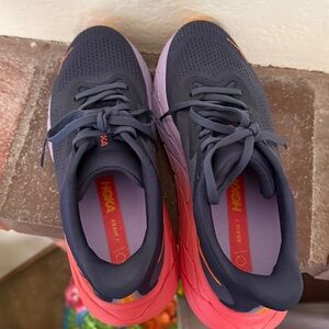Stylish blue running shoes with lilac and orange accents. Perfect for athletic activities.