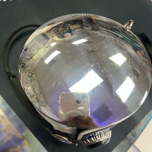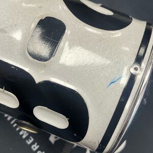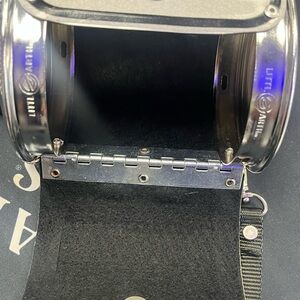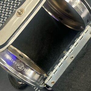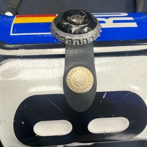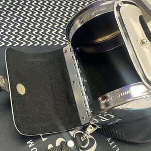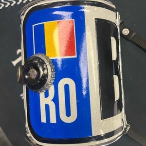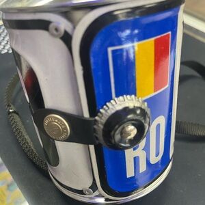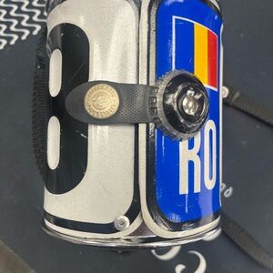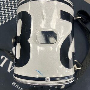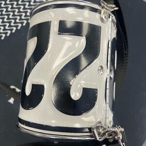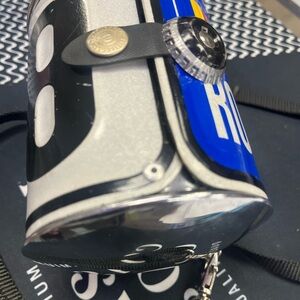 Unique can-shaped bag. Features bold blue and silver design. Black strap and accents. Eye-catching and stylish.