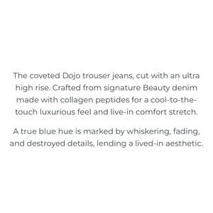7 For All Mankind Ultra High Rise Dojo jeans in a light wash blue denim. These stylish trousers feature subtle flare silhouette with a classic five-pocket design and signature embroidery on the back pockets. Light distressing and fading throughout provide a lived-in, vintage-inspired look, while the ultra high-rise waist offers a flattering and secure fit. Finished with a clean hem and high-quality hardware.