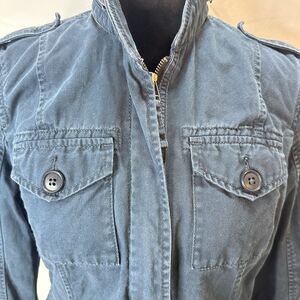 Abercrombie & Fitch Size SMALL Navy Cotton Cinch Waist Utility Jacket. This jacket is super cute to layer with denim. This jacket fully zips up and can cinch in at the waist from the inside with lots of pockets.