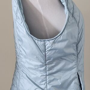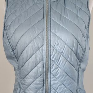 Lightweight, quilted puffer vest. Light aqua color was hard to capture with camera. It's a beautiful color (not sky blue). Zipper closure, 2 slit pockets and one inside pocket. Ideal for chic layering. Excellent, very gently used condition.