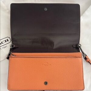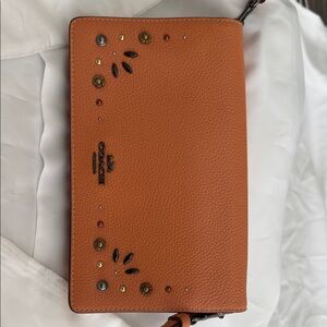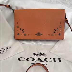 Coach Hayden Foldover Crossbody Clutch with Rivets. It is made of polished pebble leather in an orange or peach hue and features metallic studs and crystal embellishments.