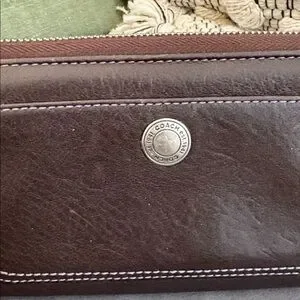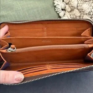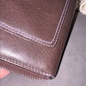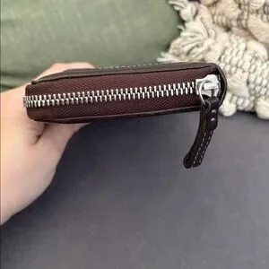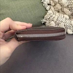 Elegant Coach wallet. Rich brown leather. Zipper closure. Stylish and functional. In excellent vintage condition. There is minor wear as shown in photos. Stitching is purple shown on last photo.
