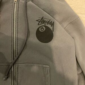 Charcoal zip-up hoodie featuring Stussy logo. Includes front pockets, big hood, and back design.