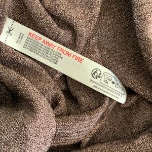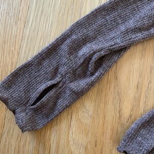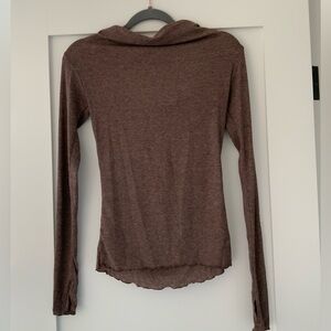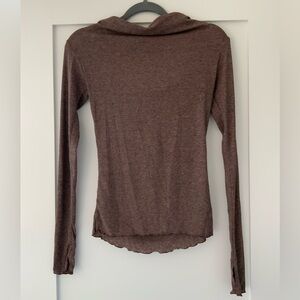 Features: Thin ribbed fabrication, off-the-shoulder neckline with slight cowl, long fitted sleeves, thumb holes