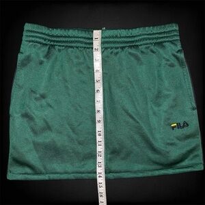 Handmade green Fila mini skirt with pockets, made by a Canadian small business that upcycles track pants. No size tags but measures approximately 32" (hard to accurately photograph, my apologies) at the waistband and 14.5" in length. Worn only once. Clean and in good condition but please note because these were made from track pants with age the waistband has degraded and has no stretch, the skirt can still be comfortably worn so long as the waist size is correct
