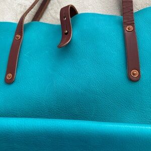Beautiful color for spring. Leather is thick and gorgeous. Stylish teal leather tote bag with brown handles, perfect for everyday use.