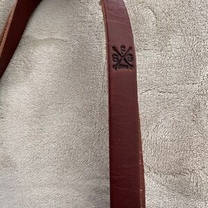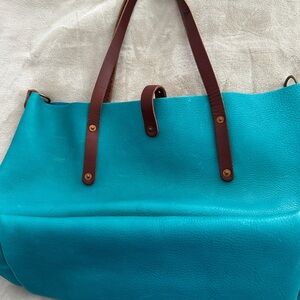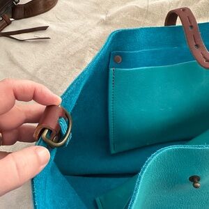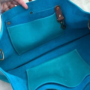 Go Forth Goods Extra Large Avery tote in turquoise with saddle handles and closure. Lots of interior pockets. This is a BIG bag - loads of room to hold everything. Comes with d-rings for crossbody strap. I don’t have the crossbody strap.