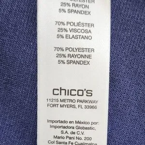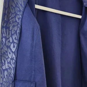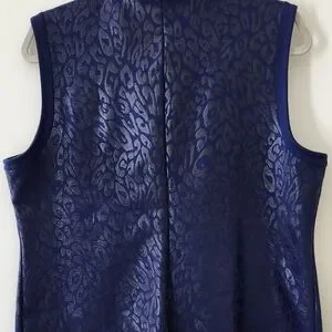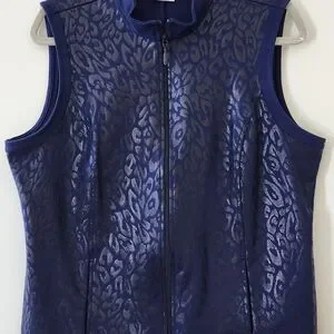 Lightweight vest with zipper up front and 2 slit pockets. Mandarin collar. Navy blue with a shimmer animal print. Excellent, very gently used condition. Chico's size 2 = Large