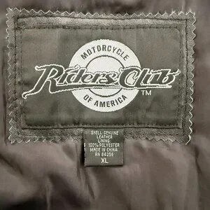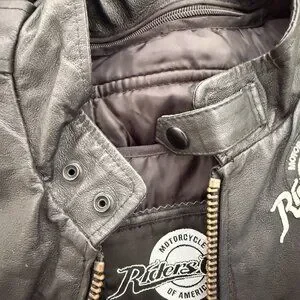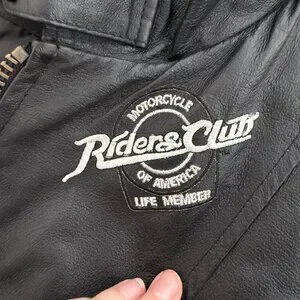 โจ Heavy, substantial vintage Harley-Davidson Riders Club leather jacket featuring bold embroidered graphics and classic American biker styling. Crafted from genuine leather with a fully lined interior, this jacket has a structured, weighty feel that immediately signals quality.The back showcases a large embroidered Harley-Davidson โ1โ flag patch, while the lower back and chest feature Riders Club of America โ Life Member embroidery. Designed with a zip-front closure, snap-collar detail, zippered pockets, and elasticized hem for a comfortable yet secure fit. This is a true statement piece with serious presence.
