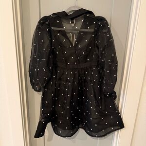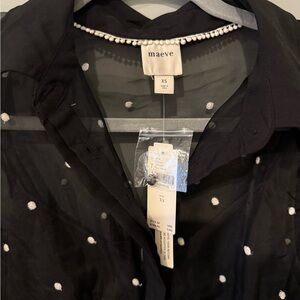 Elegant sheer dress by Maeve by Anthropologie. Features white polka dots on black fabric. Ideal for evening wear. NWT. Got for an event and didn’t end up wearing it