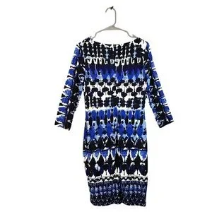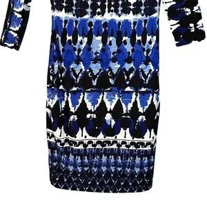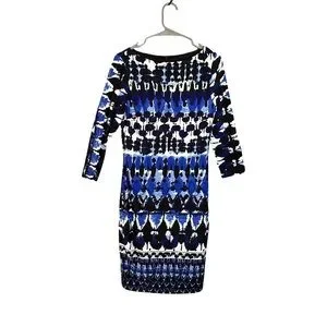 Joseph Ribkoff Abstract Print 3/4 Sleeve Stretch Knit Lined Blue Black White Sheath Dress 8