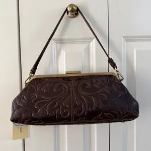 NWT, Gianni Conti Tooled Brown Embossed 100% Italy Leather Satchel Bag with Top Antique Brass Tone Kiss Lock, Adjustable Cross Body Shoulder Strap and Dust Bag