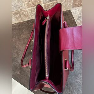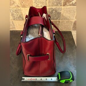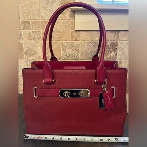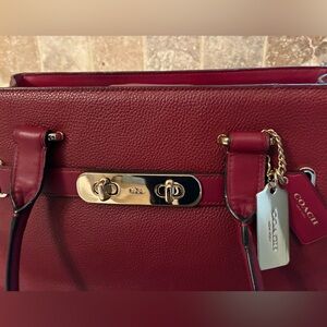 Sophisticated Coach satchel in dark red leather. Features gold-tone hardware and dual handles. Perfect for any occasion. Bag color is best shown in the first picture (darker red). Two zipper pockets and two slots inside. Beautiful!