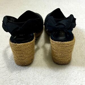 Adorable Lauren Ralph Lauren branded Helma Espadrille style sandals in a classic black color with a tan rope/twin like trim wedge heel, slip on slingback style with bow accent on back, rounded closed toe, cushioned, appx 3in block heel, 100% cotton lining/cotton + poly upper.
