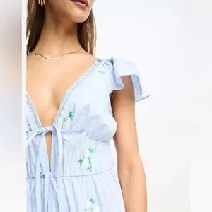 Charming sky blue maxi dress with floral accents. Features flutter sleeves and a flowing silhouette.