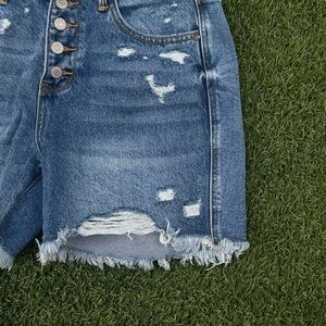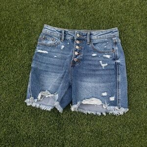 These button fly denim shorts by Judy Blue offer a stylish distressed look with a raw, cut-off hem. The medium-light wash and frayed details make them a perfect choice for casual summer days.
