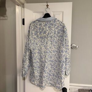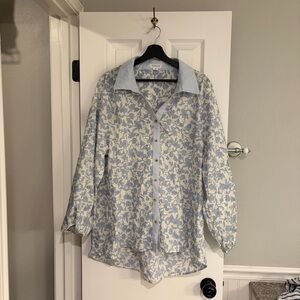 Elegant floral top with button-down front. Features a classic collar and long sleeves. Perfect for casual outings.