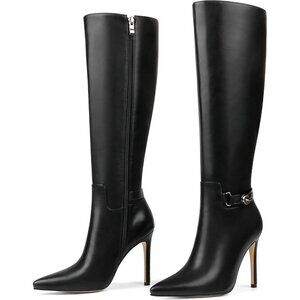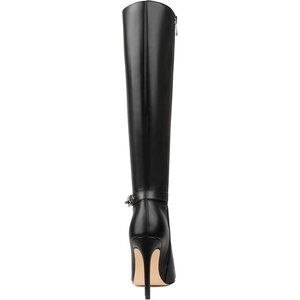 Women's Black Matte Stiletto Slouch Knee High Dress Boots Pointed Toe Buckle