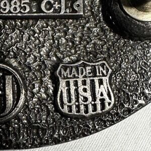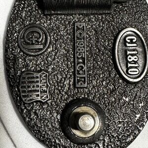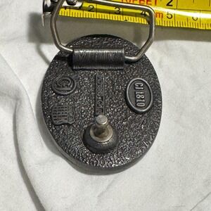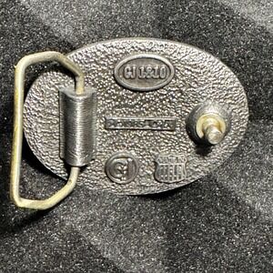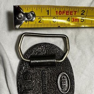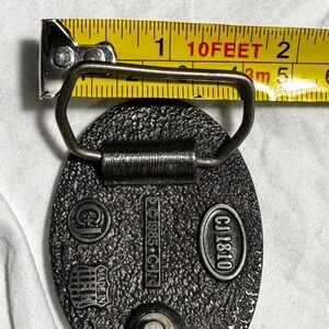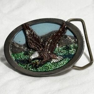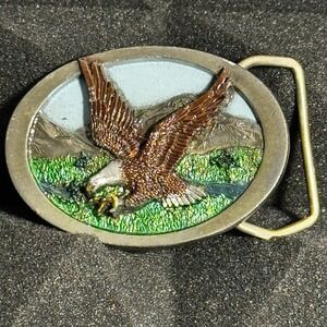 This vintage belt buckle features an eagle in flight design with mountains and a river in the background. Made of metal and crafted by C&J in the USA in 1985, this unique accessory is perfect for adult unisex wearers looking to add a touch of retro charm to their outfit. The colorful and detailed design makes it a standout piece for those who appreciate specialty vintage items from the 1980s.