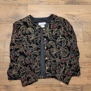 Elegant black blazer/ lightweight spring jacket with intricate gold and purple paisley design. Features button closure and shoulder pads. Made in Canada 🇨🇦