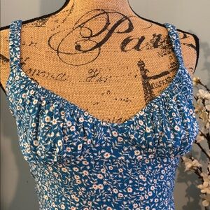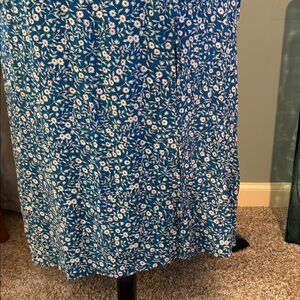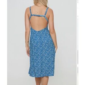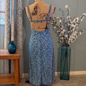 Princess Polly Georgia Print Floral Open Back Midi Dress. Blue ditsy floral dress. White flowers. Side slit. Open back. Half zipper. Great condition. One strap needs to be restitched - easy fix. Size 2.