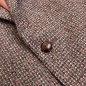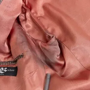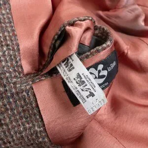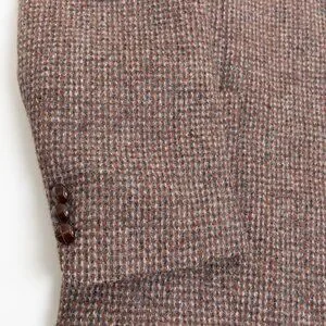 Excellent condition of outer shell. The Harris Tweed wool is thick, sturdy, and free of holes or snags. Discoloration/fading to the lining fabric, primarily near the underarms and inner seams. Small tear in the lining fabric at one of the interior seams
