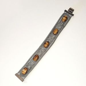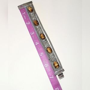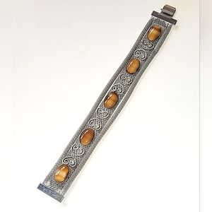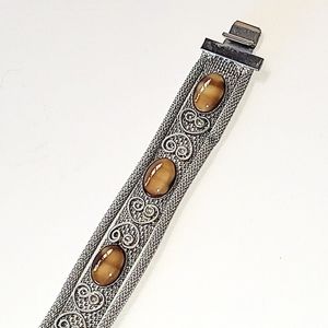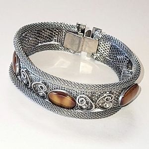 VINTAGE SILVER MESH BRACELET - FAUX TIGER'S EYE SLAG GLASS STONES