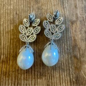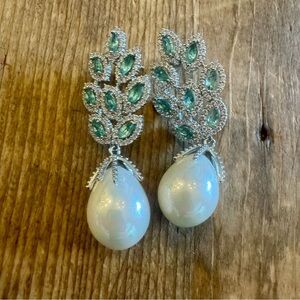 Chic silver earrings featuring green leaf accents and elegant pearl drops. Ideal for any occasion.