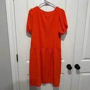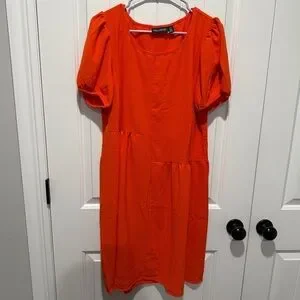 Elevate your style with this vibrant orange midi dress. Features chic puff sleeves with elastic. Perfect for any occasion. Dress up or down.