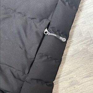 Stylish pink and black puffer jacket with a hood. Perfect for cold weather. Super warm with two zippered side pockets. Pit to pit 17 inches overall length 28 inches. Fur trim will be included and is removable, however The hood is not. please note very very faint stain showing in the last picture.