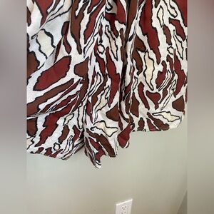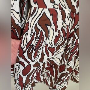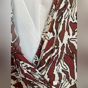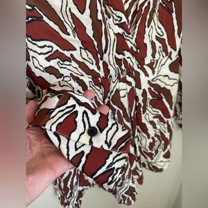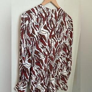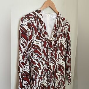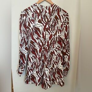 Longsleeve Collared Vneck Patterned Abstract Leaf Jungle Animal Zebra Striped Red Black Cream Beige Neutral Tailored Sophisticated Chic Fashion Designer HighEnd Luxury Drape Flowy Effortless Crossover Feminine Modern Contemporary Office Business Workwear Cocktail Party Date Holiday Vacation Resort Travel Fall Autumn Winter Spring Summer Lightweight Comfortable Casual Dressy Statement Versatile Preppy Bohemian Boho Equestrian Safari Loose Premium Sustainable Vintage Retro Essential Staple Unique Original Iconic Classic Timeless Inspired Designer