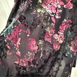 Chic Boutique floral sleeveless tunic blouse featuring a bow tie detail. Perfect for adding a touch of elegance to any outfit. Sheer. Slits on sides. Elegant velvet floral and Glitter accents through out.