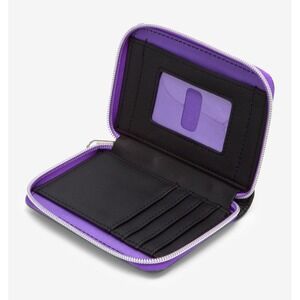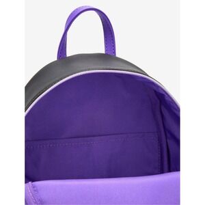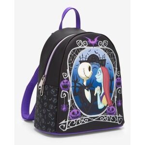 The Loungefly Nightmare Before Christmas Jack & Sally Pumpkin Frame Backpack and matching WALLET set is a mini backpack featuring a semi-circle shape with a floral pumpkins pattern. Made of polyurethane material with silver hardware accents, it has a zip closure and a purple shoulder strap handle. The exterior and lining colors are multicolor and purple respectively, perfect for occasions like travel, parties, or casual outings. This backpack is inspired by the iconic characters Jack Skellington and Sally from The Nightmare Before Christmas, adding a touch of movie-themed whimsy to any outfit or Disney Parks outing.