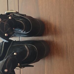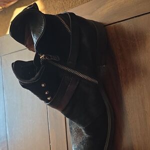 An older pair of AS98 suede boots. Hardly worn with slight wear on the heels. Buckled with side and wrap around zippers and studs. Embossed UPC, figuratively, and slogan designs.