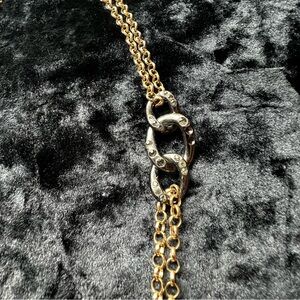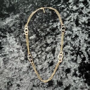Sleek and modern gold-tone necklace featuring a double chain design with bold silver-tone and black oval link accents with rhinestones. This versatile piece is perfect for everyday wear, layering with other necklaces, or adding a polished touch to casual and dressy outfits alike.