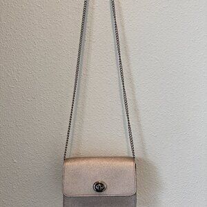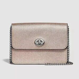 Elevate any outfit with this stunning Coach crossbody in champagne-gold metallic cross grain leather with a turn-lock closure. The textured leather adds dimension and shine, while the silver turn-lock closure gives it a polished look. Highly versatile and can be paired with your favorite evening dress or travel wear for ease and comfort.
