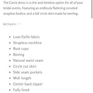 The Carrie dress is a chic and timeless option for all of your bridal events. Featuring an endlessly flattering corseted strapless bodice, and a full circle skirt made for twirling.