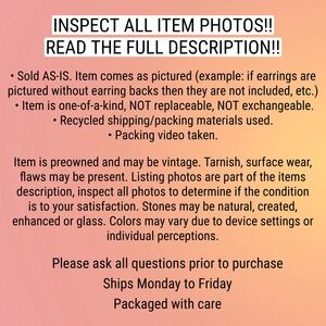 **NOTE** Sold AS-IS. Item comes as pictured (example: if earrings are pictured without earring backs, then they are not included, etc.) Item is preowned and may be vintage. Tarnish, surface wear, flaws may be present. Listing photos are part of the item's description, inspect all photos to determine if the condition is to your satisfaction. Stones may be natural, created, enhanced or glass. Item is one-of-a-kind, NOT replaceable, NOT exchangeable. Colors may vary due to device settings or individual perceptions. Recycled shipping/packing materials used. Packing video taken.