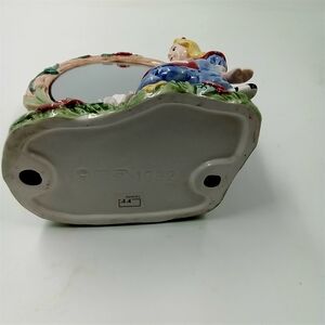 Charming Alice in Wonderland themed figurine mirror with vibrant colors. Features Alice and a rabbit. Perfect for decor.Made by FRITZ AND FLOYD.Vintage 1992 discontinued.