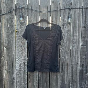 Ann Taylor Black V Neck Multi Media Embroidered Lace Inset Short Sleeve Blouse S