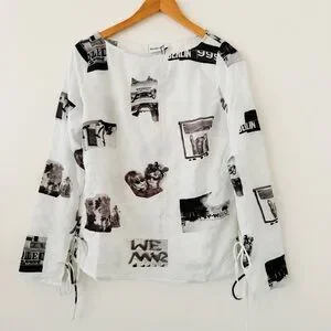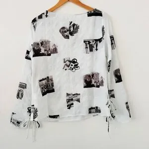 Fun trendy and kind of abstract - black and white graphics on a white texture blouse. NWOT - size large. Tie sleeves