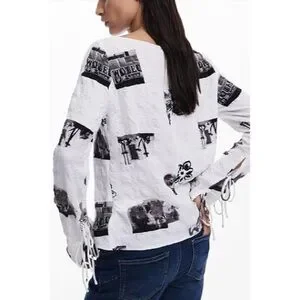 NWOT Desigual Textured Tie Sleeve White & Black Graphic Top