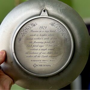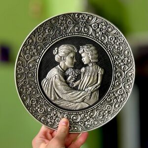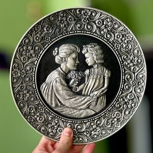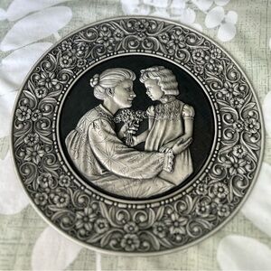 VTG Dainty Sculptured Mom & Daughter Heart Warming Round Etched Art Floral Decor